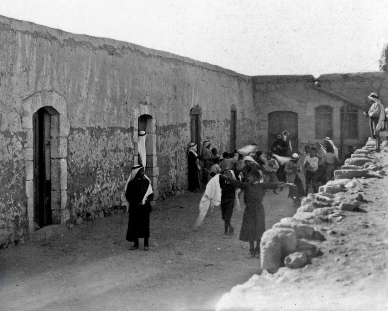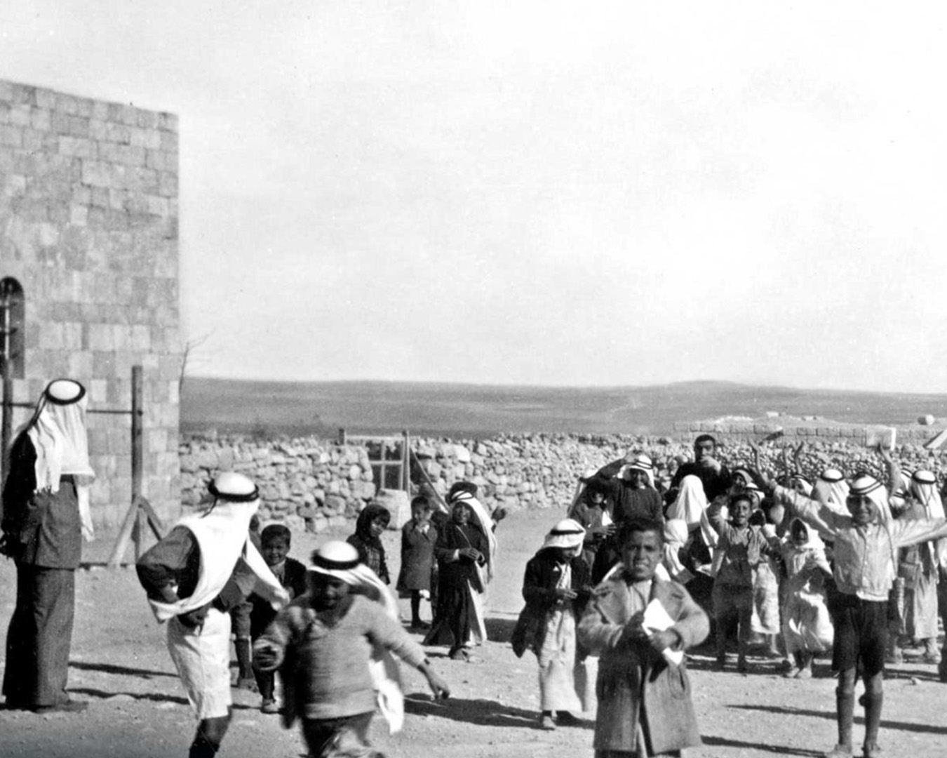 This photograph depicts student activity at a school in Madaba in 1933, where children gather in an open courtyard to participate in group games.