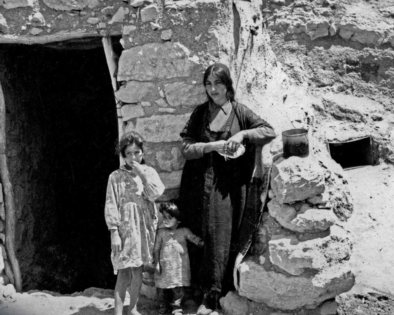 This photograph reveals a rare glimpse into the early stages of settlement in Madaba in the late 19th century, showing a woman standing at the entrance of a simple cave with two young girls.